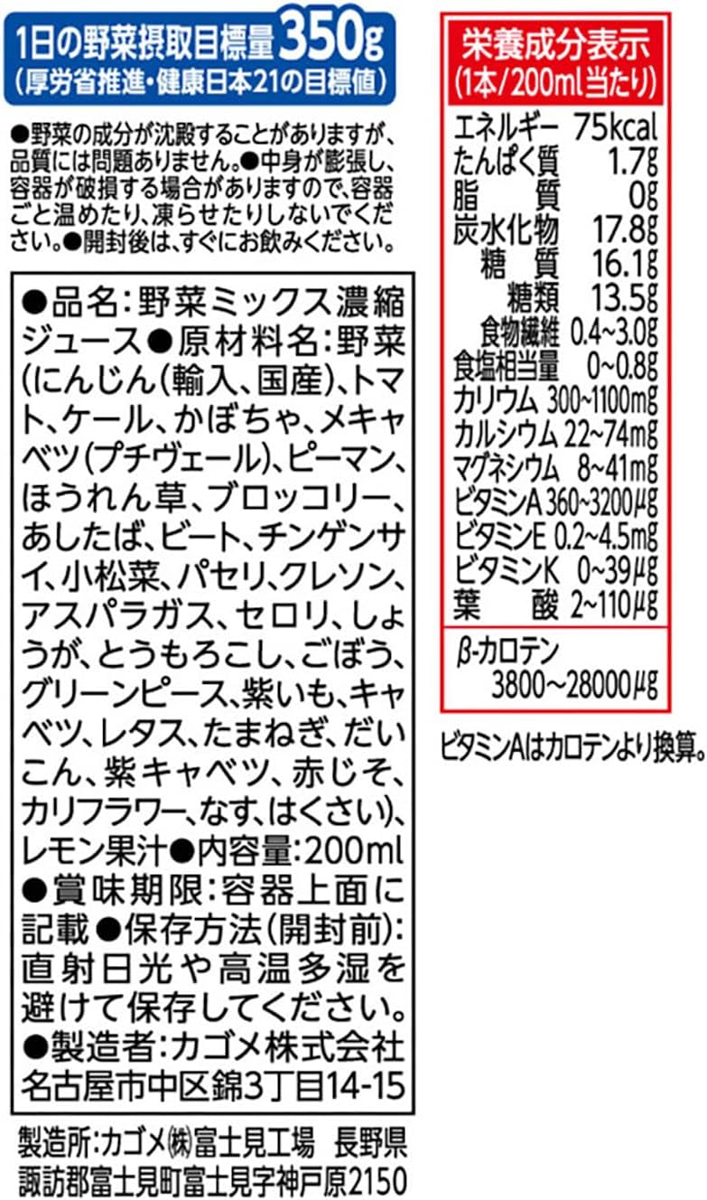 - 野菜一日これ一本200ml×24本は、「これ1本」に彩り豊かな30品目の野菜350g分を使用。砂糖や香料、栄養強化剤などを使用せずに野菜本 来のおいしさと栄養※を提供する無添加の野菜汁100%ジュースです。トマトの濃厚な味わいを楽しみながら 、野菜と栄養※を手軽に補うことができます。※食物繊維、カリウム、カルシウム、ビタミンA、リコピン