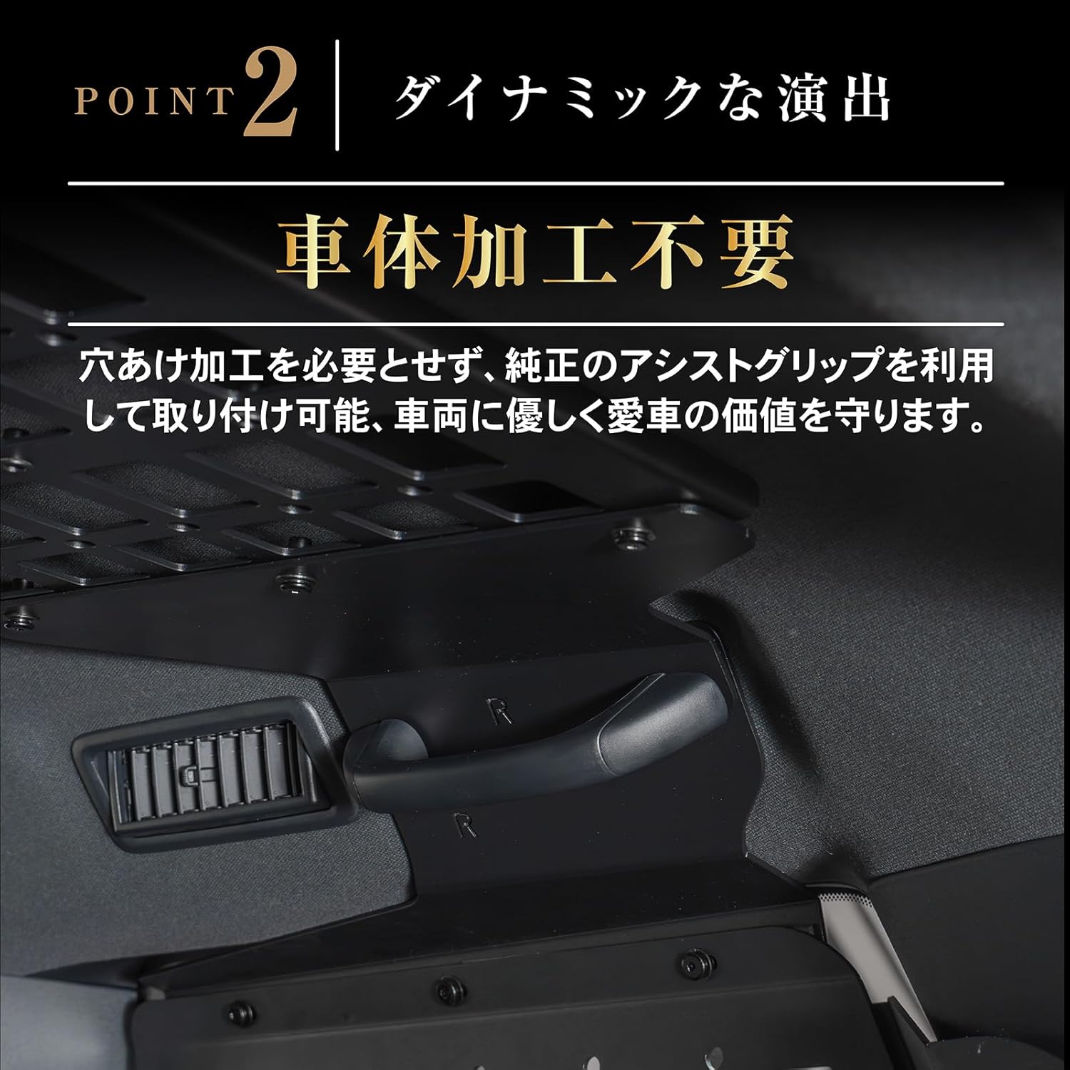 - POINT.2 「車体加工不要」 穴あけ加工を必要とせず、 純正のアシストグリップを利用して取り付け可能、 車両に優しく愛車の価値を守ります。