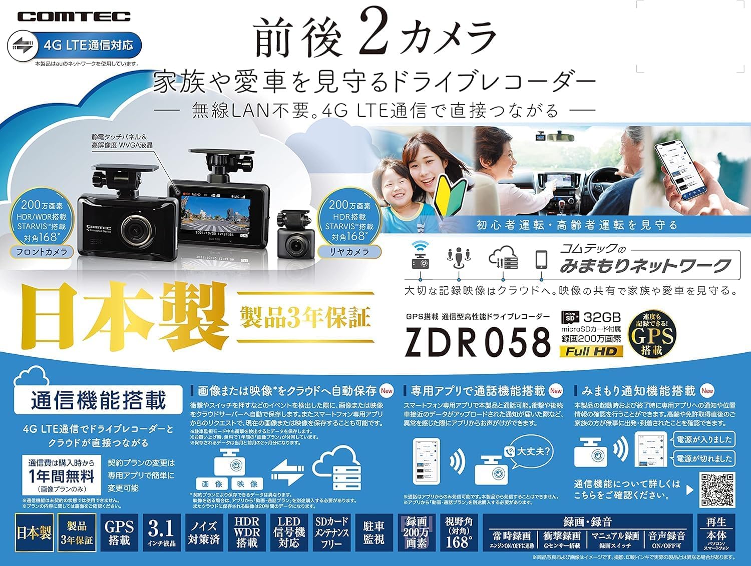 コムテック ドライブレコーダー ZDR055 STARVIS 2搭載で夜間撮影性能向上 前後2カメラ 前後200万画素 FullHD GPS/後続車両接近お知らせ機能/運転支援機能搭載 日本製 3年保証 常時録画 衝撃録画 駐車監視 高速起動 液晶 出張取付サービス対応