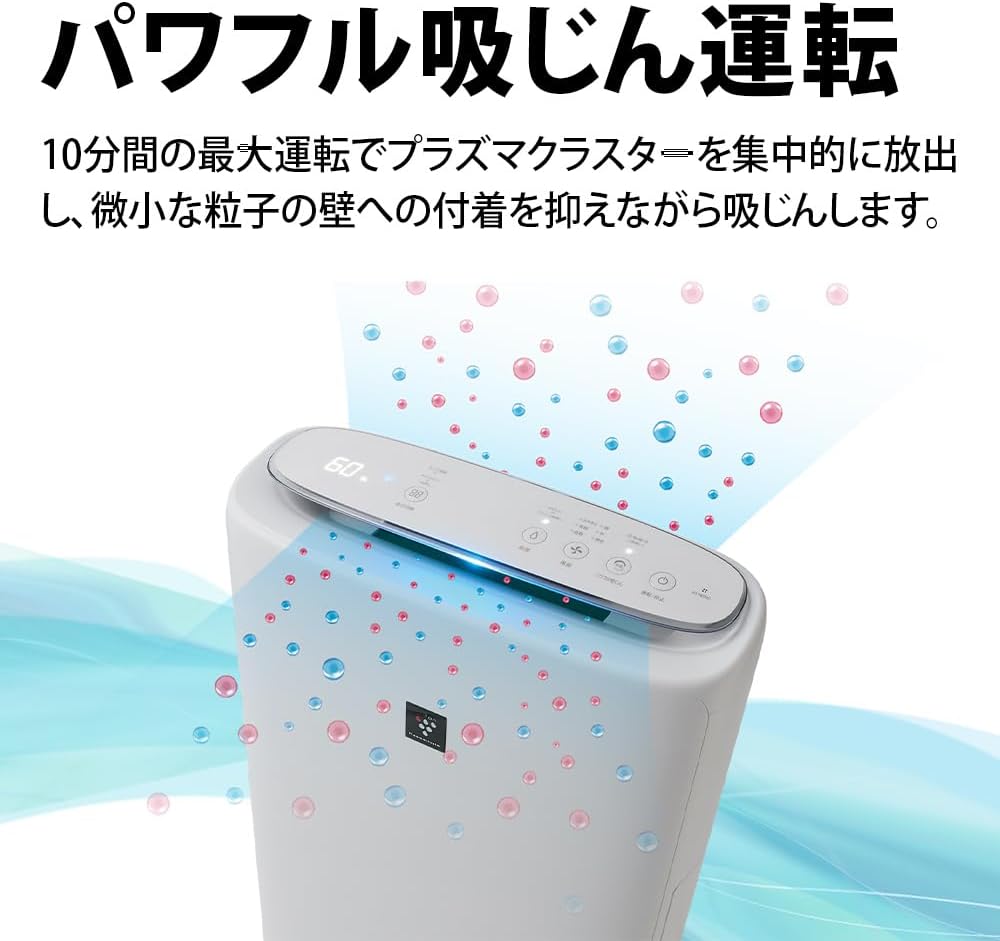 - たっぷり加湿と低騒音でワンルームや寝室にも置きやすい薄型スリムモデル。シャープ独自の空気清浄技術「プラズマクラスター25000」を搭載。遠くのホコリも素早く吸じんする「コアンダフロー」。