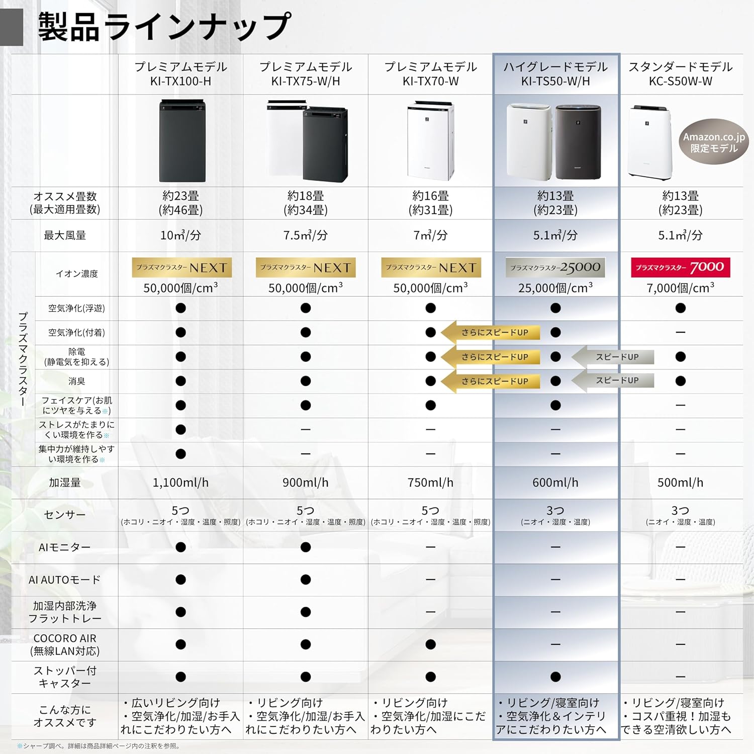 シャープ 加湿 空気清浄機 KI-TS50-W プラズマクラスター 25000 浮遊 ・ 付着 ウィルス 花粉 空気浄化 静音 薄型スリム 加湿 600mL/h