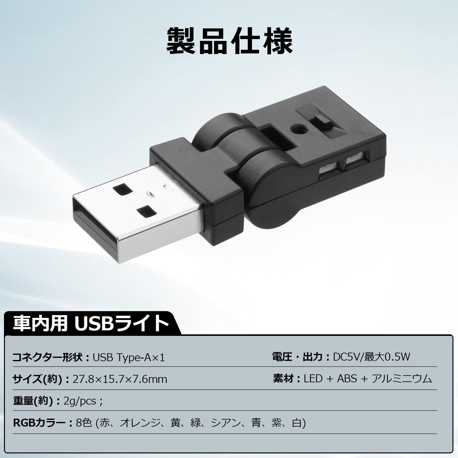 スイング USBライト LED 車内用 Type-A 8色 180°首振り 自動点灯 調光 RGB アンビエントライト