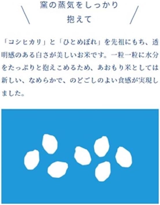 透き通るような白さや柔らかい食感や粘り強さなど、これまでの青森県産米にない特徴を持ったお米です。デザインは、どこまでも晴れわたる青森の空をイメージしたもので、背景は「空色」、文字は「陽の色」となっています。空色に白色のシギを描き大空へ羽ばたく様子も描かれています。 - 青森県産はれわたり100%