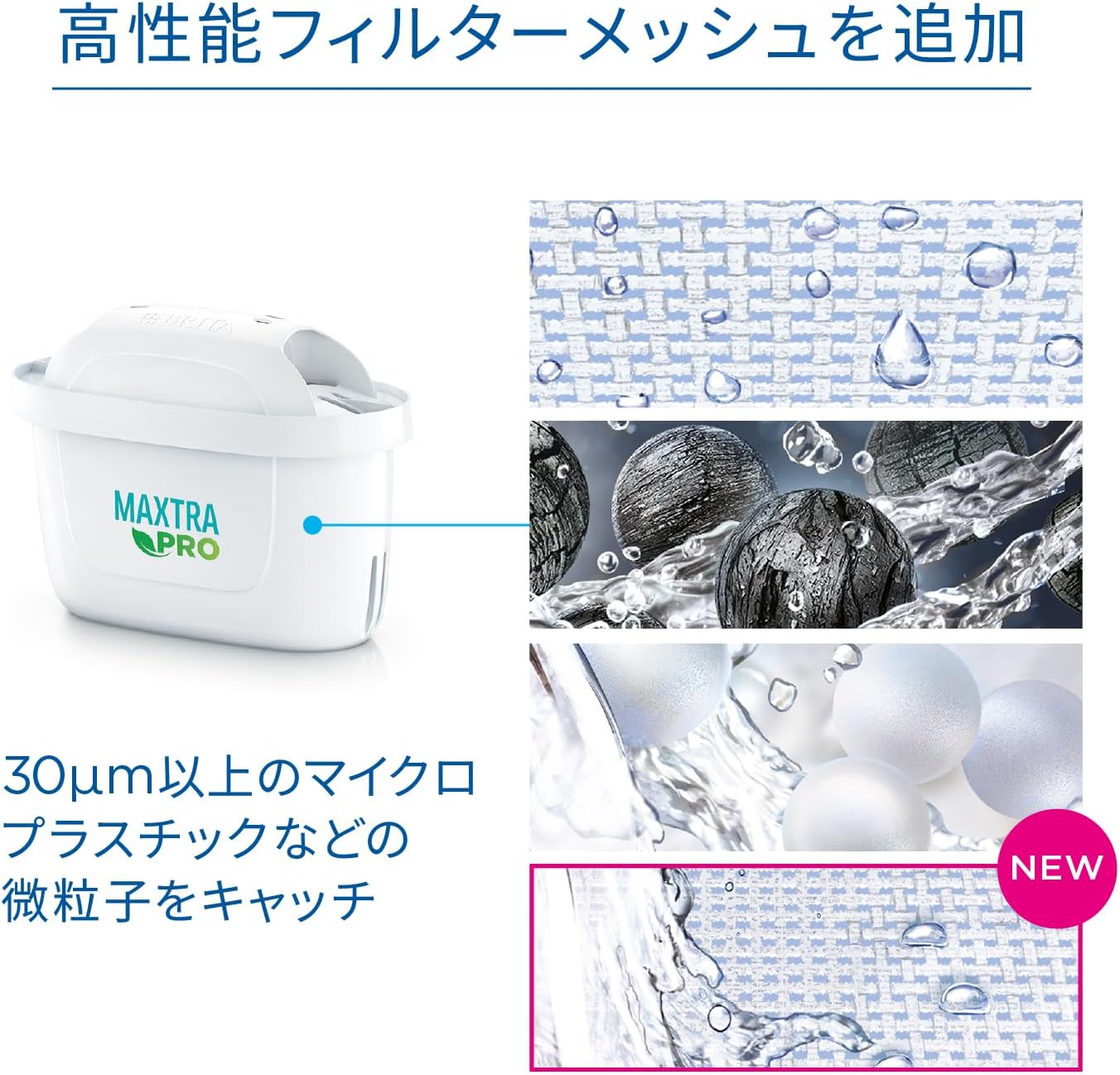 - 【高性能フィルターメッシュ】高性能フィルターメッシュの追加で微粒子のろ過能力が向上。粒子のサイズが≧30μmに減少*(*APMO R&T LAB.においてNSF/ANSI 42 Class V and VI に従ってテスト済)