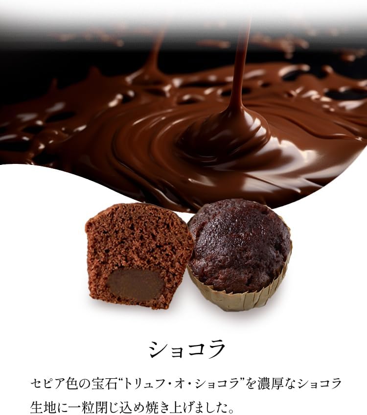 ⦁ おいしさそのままかわいいミニサイズ。しっとり焼きあがった生地の中に美味しさを閉じ込めたトリュフケーキが、かわいいミニサイズになりました。 4つのテイストをお楽しみいただけます。