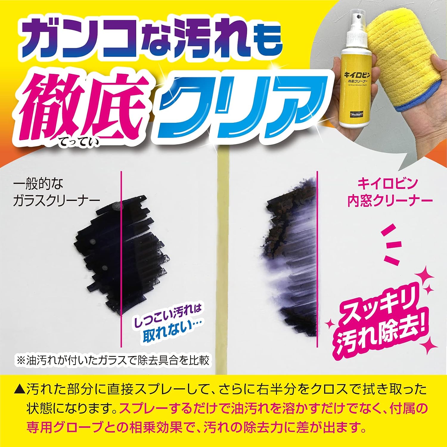 - また、ガラスに付着した手アカやタバコのヤニ汚れに浸透する溶解成分と、汚れをかき取り吸着するマイクロファイバー100%クロスの相乗効果により、ガンコな汚れをしっかり除去!透明感のあるスッキリきれいなガラスに仕上がります。
