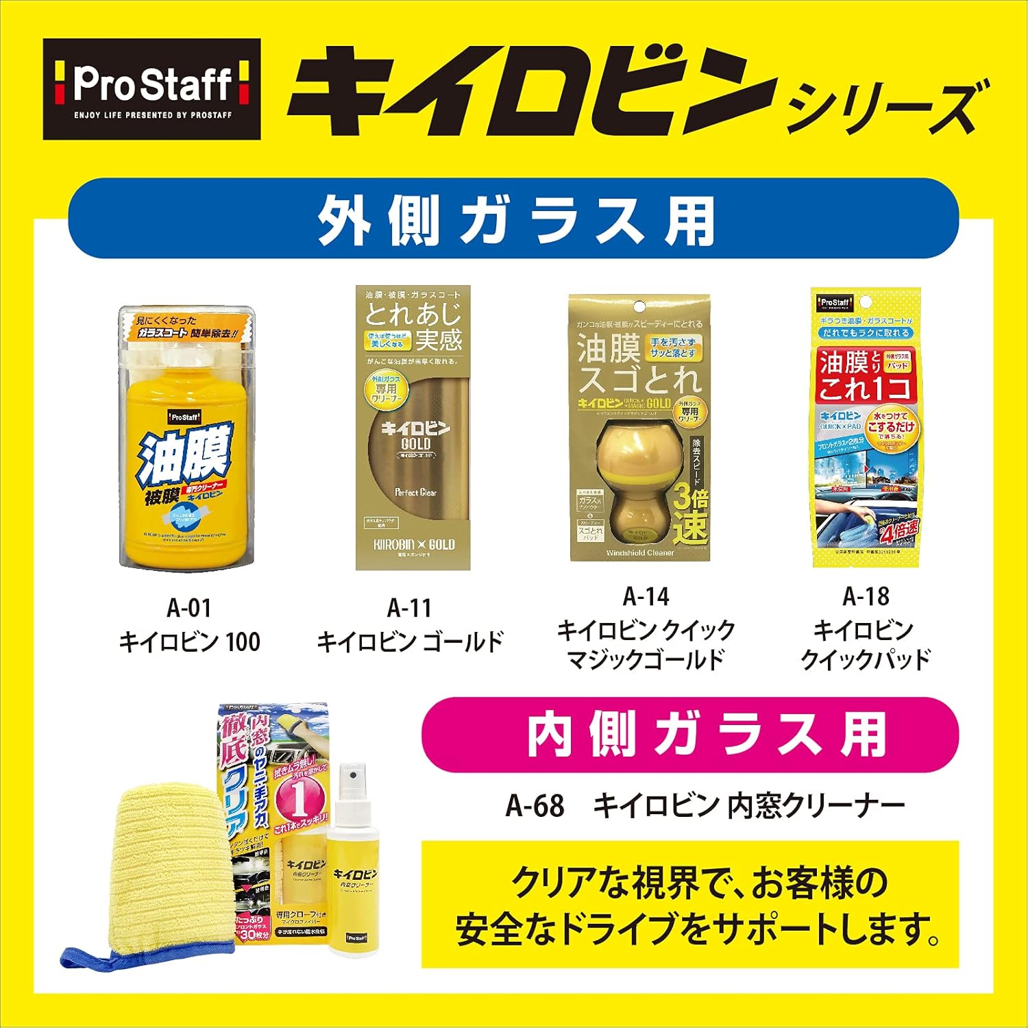 - 油膜とり「キイロビン」シリーズは交通事故の原因となる視界不良をなくし、安全な視界を確保します。