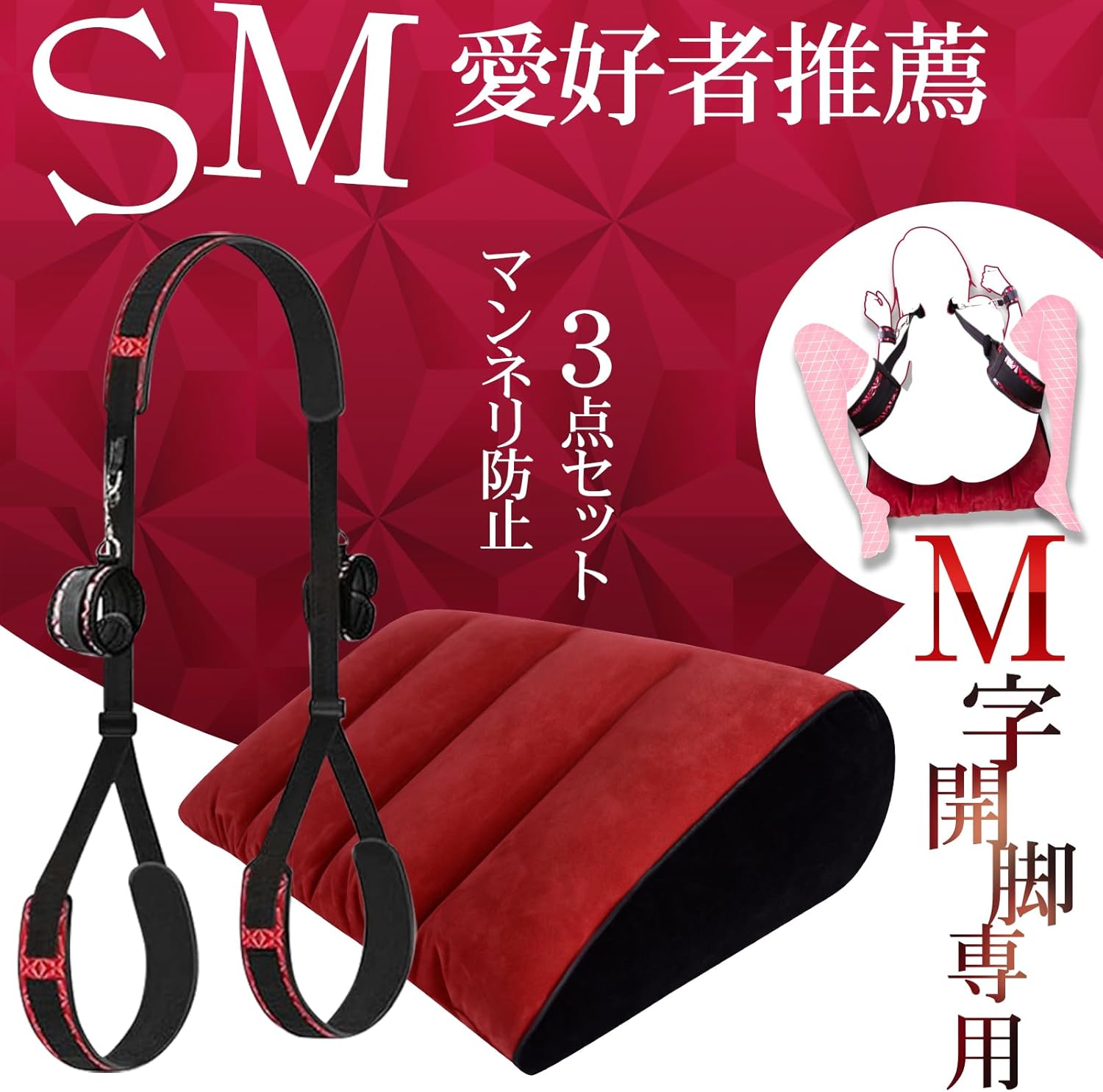 【人間工学×SM】M字開脚 拘束具 3点セット|可調式ベルト&手枷+深め姿勢クッション 痛くない BDSM初心者 KOUMI