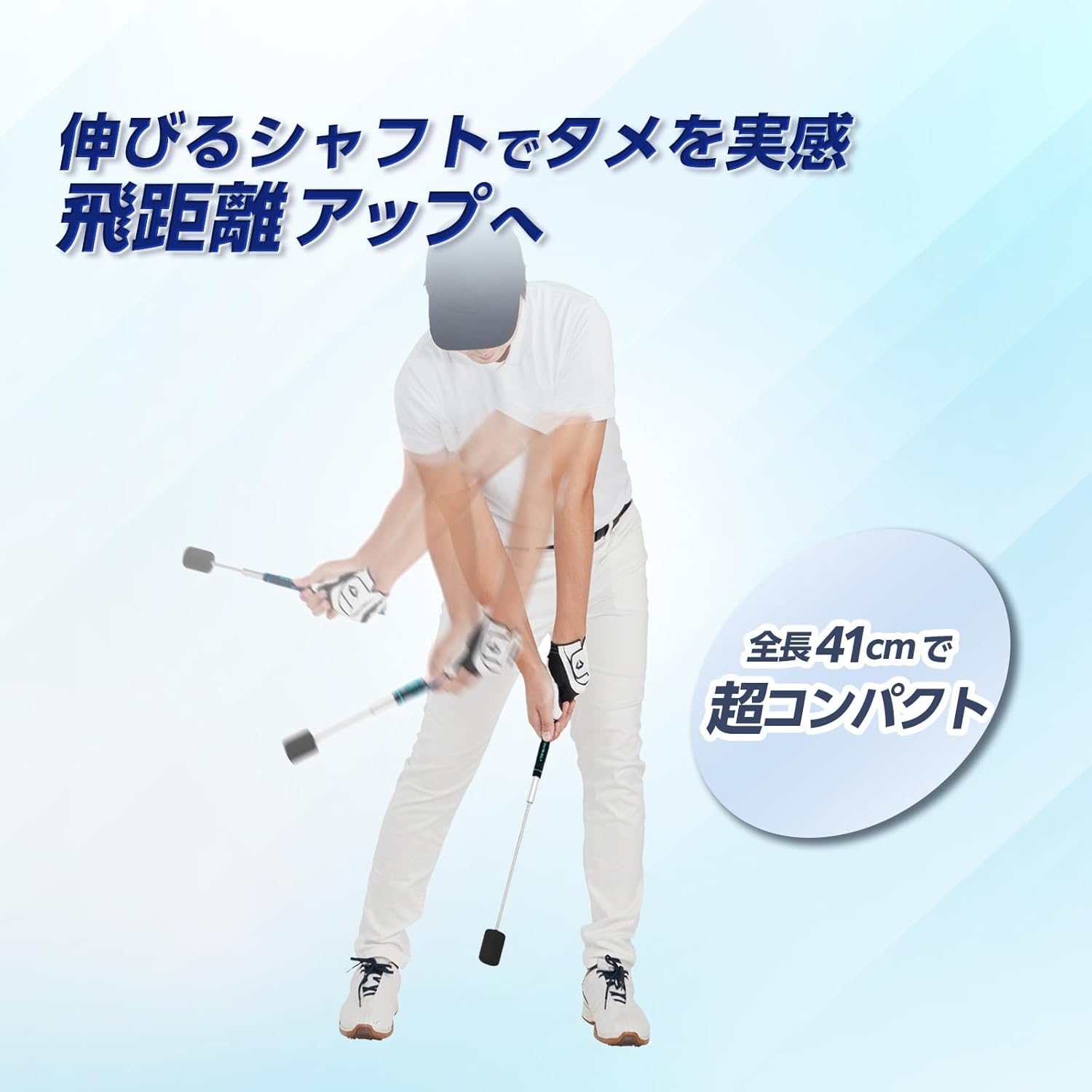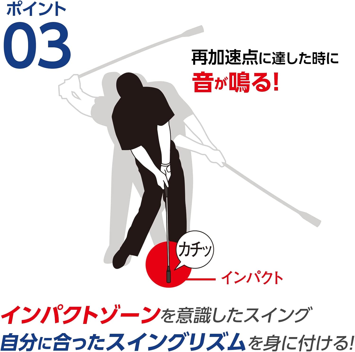 • スイングの加速でシャフトが伸びることで、正しいインパクトゾーンを体感できる約41cmのコンパクトなスイング練習器です。