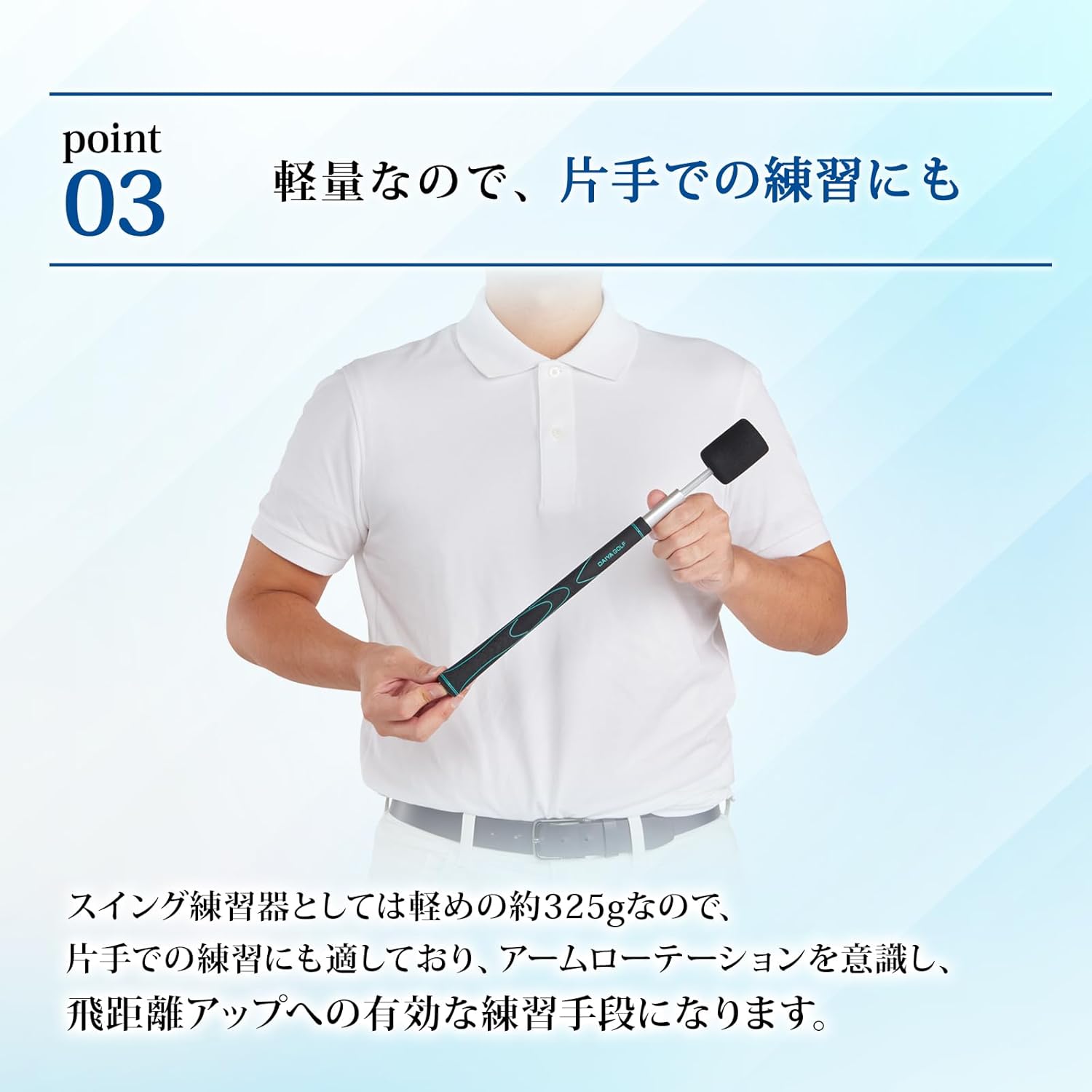 • ダイヤスイングシリーズで最短、最軽量モデル。室内での素振りや、外出先への持ち運びもできるのでいつでも気になった時に使用できます。片手でのスイング練習にも最適です。