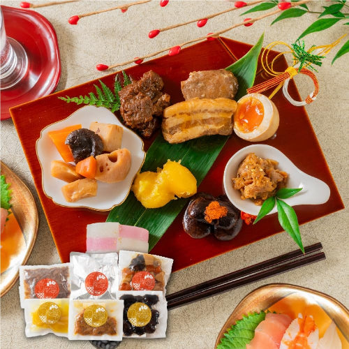 - 【品目】 ・飛騨牛すね肉味噌煮込み(110g) ・豚のトロ角煮・煮卵(170g) ・帆立の旨煮(35g) ・栗きんとん(50g) ・花豆(100g) ・筑前煮(130g)