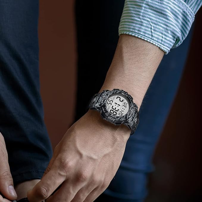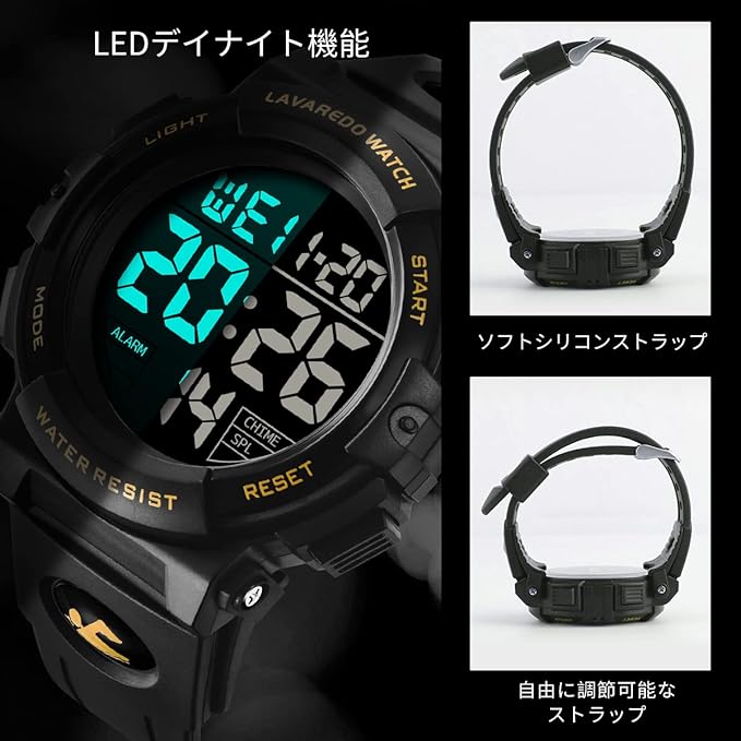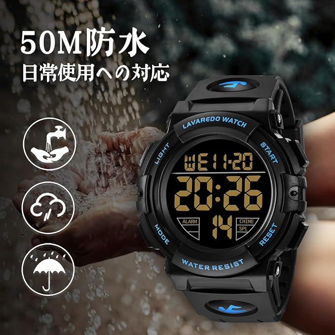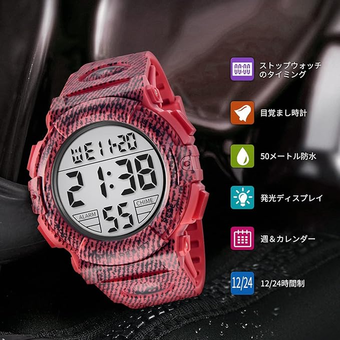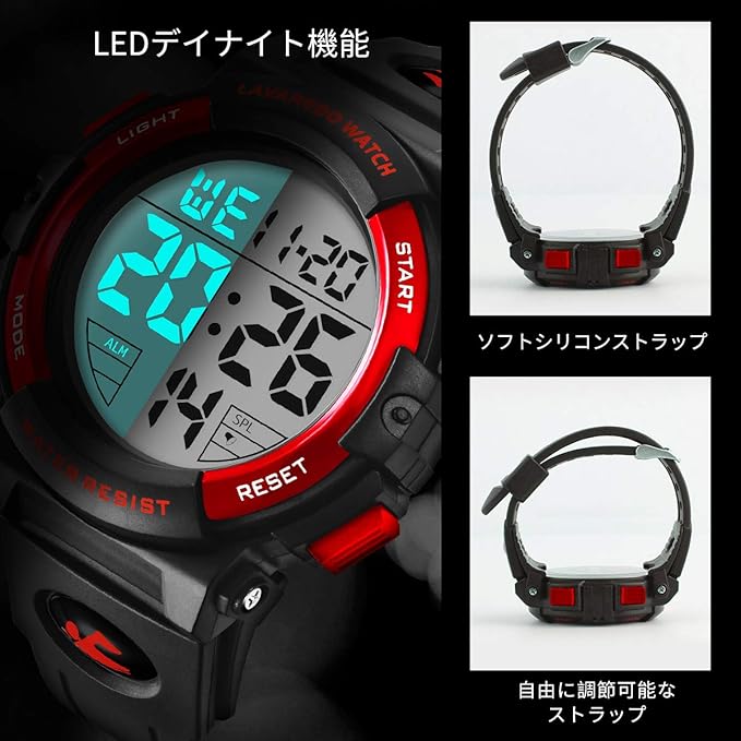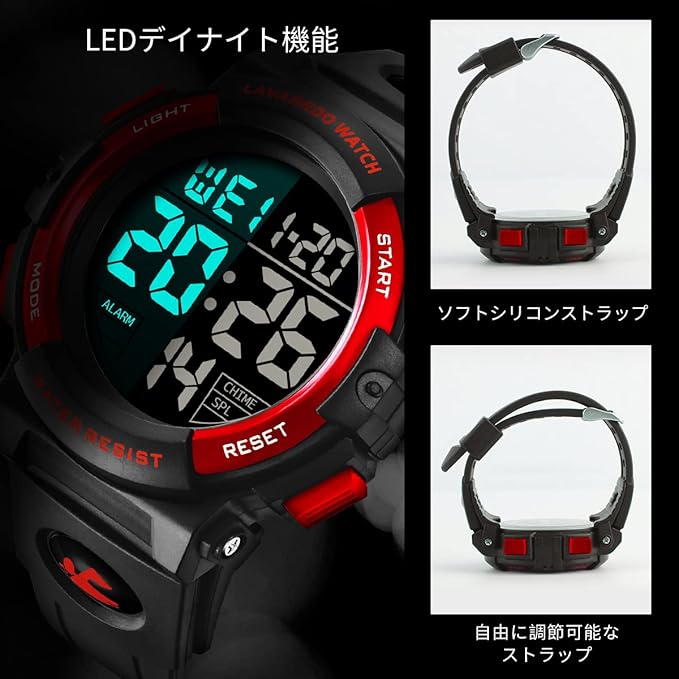 - ♚[多機能付き デジタル腕時計]多機能なデザインと高品質PU素材を採用しており、デジタル表示、LEDバックライト、日付、曜日、アラーム、ストップウォッチの機能が含まれて、日常使いに最適。5ATM日常防水、耐衝撃性と耐久性があり、耐用年数が長い。