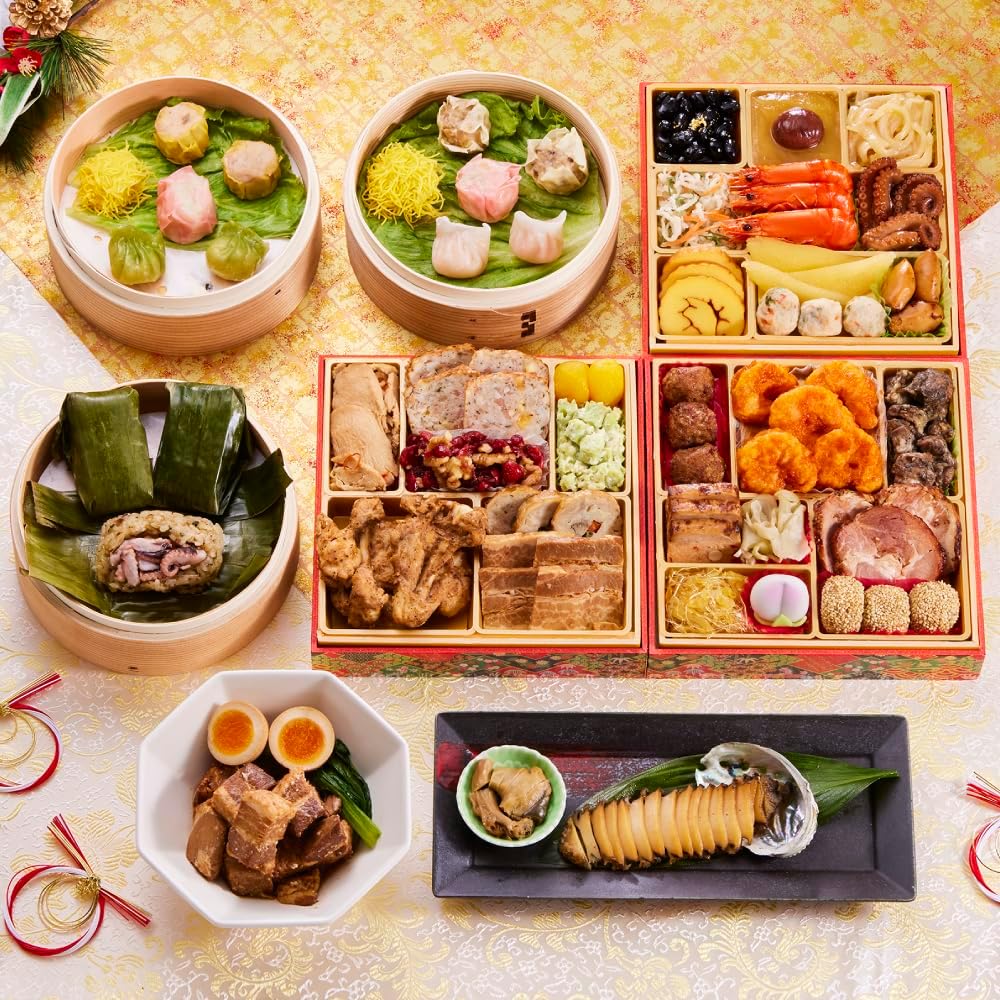 - 🦐おしながき【一の重🌸】鶏むね肉のさっぱりわさび和え、ミートローフ、あんず甘露煮、クランベリーくるみ、数の子と枝豆のサラダ、手羽元黒胡椒焼き、チキン三昧、ホエー豚の旨煮 【二の重🌸】黒糖黒酢の国産肉団子、海老のチリソース煮、豚タン炭火焼、鶏中華テリーヌ、あっさりザーサイ、国産黒糖焼き豚、ふかひれ風中華くらげ、桃花餅、胡麻団子 【三の重🌸】黒豆、渋皮栗甘露煮、きんとん、イカの柚子味噌和え、紅白なます、有頭海老の艶煮、たこの旨煮、伊達巻、味付数の子、人参と大葉のカニ団子、味付子持イカ【別添品🌸】福良鮑、たこちまき、湯浅醤油豚角煮、黒豚シューマイ、錦糸シューマイ、さくらシューマイ、海老シューマイ、海老餃子、ヒスイ海老餃子