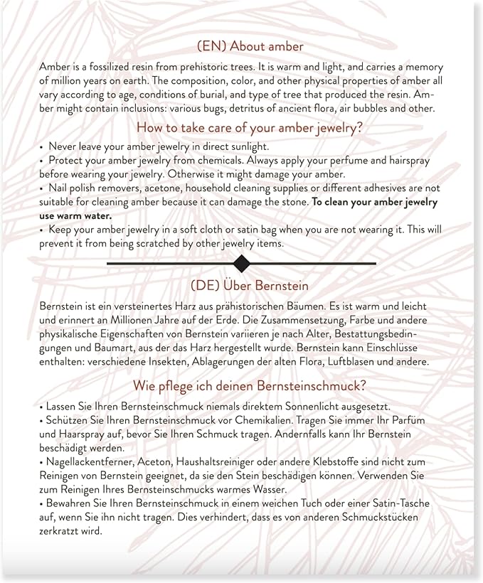- 【アクセサリーの重量感が苦手な方にもおすすめ】琥珀は樹液の化石であり、鉱物ではないため非常に軽いのが特長で、長時間着けていても重さを感じにくいです。つけていることを忘れる程軽いのでアクセサリーが苦手な方にも人気です。