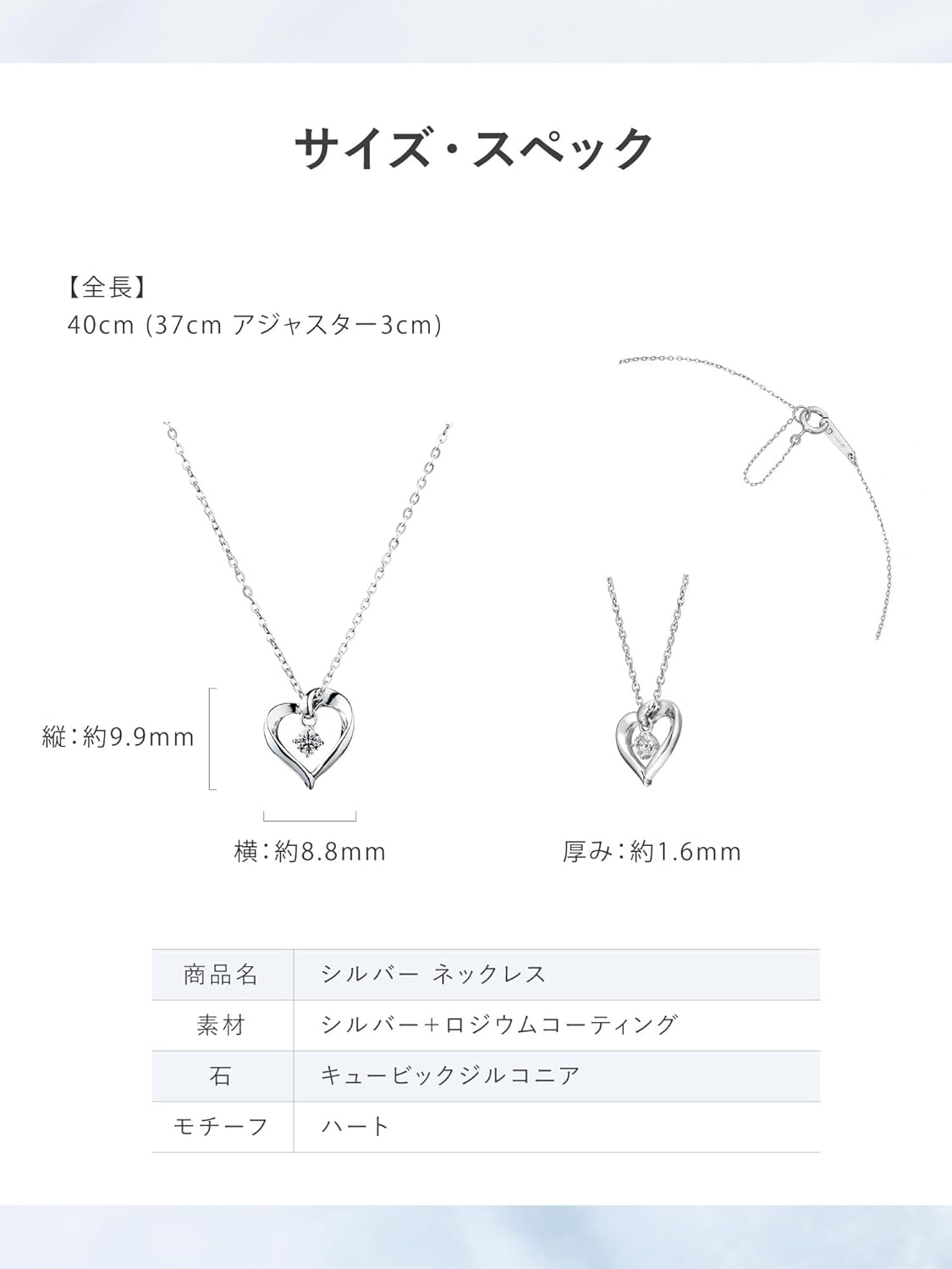 - ・仕様:【全長】40cm (37cm アジャスター 3cm) 【モチーフ】縦:約9.9mm 横:約8.8mm 厚み:約1.6mm