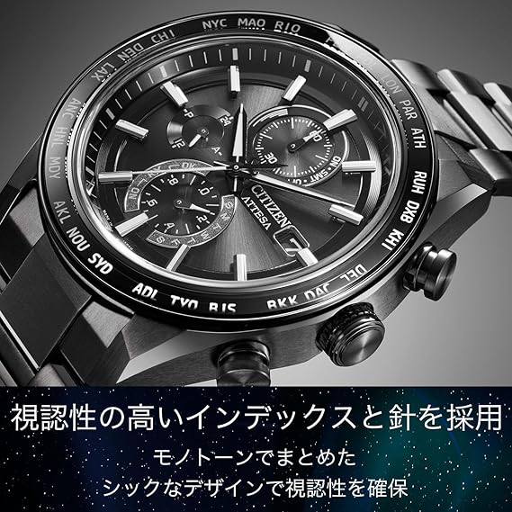 • 【差し色を加えずモノトーンでまとめたシックなデザイン】ブラックとシルバーで統一されたモノトーンの色調がインデックスの視認性も確保。ベゼルにはシルバー蒸着で仕上げた都市名表示し、リング状のサファイアを埋め込んだ輝くベゼルが高級感を漂わせます。素材はスーパーチタニウムだから軽量(約93グラム)で腕に軽やかにフィットします。