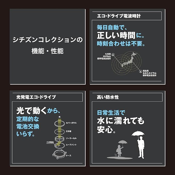 - 【いつでも正確な時刻を刻み続けるシチズンの電波時計】定期的な電池交換不要のシチズン独自技術の光発電エコ・ドライブ搭載で手間いらず。正確な時刻に同期する電波時計。シチズンが30年間挑戦をし続けた、電波時計の技術が詰まっています。