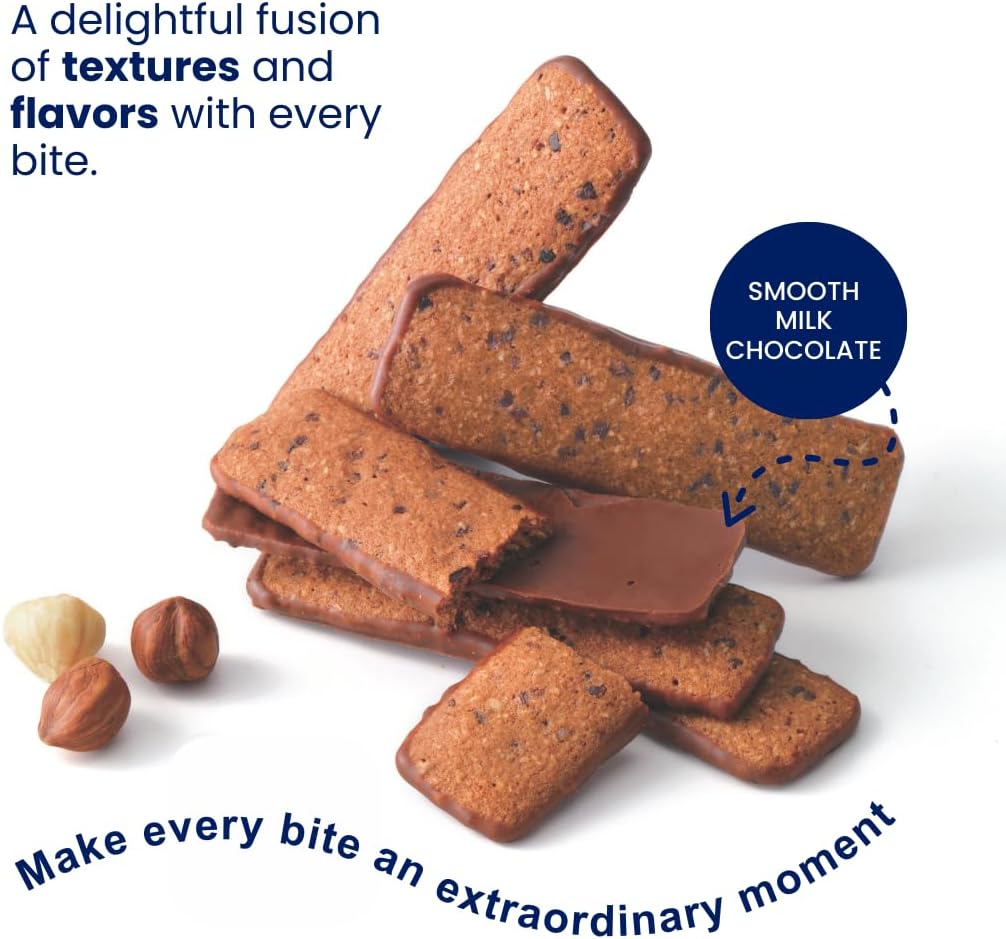 • 細かく砕いたカカオ豆と香ばしいヘーゼルナッツパウダーをココア生地に練り込み、丁寧に焼き上げました。片面にはなめらかで口どけの良いチョコレートをコーティング。ほろ苦いカカオとまろやかなチョコレート、香ばしいヘーゼルナッツが絶妙に調和した、贅沢なひとときをお楽しみいただけます。